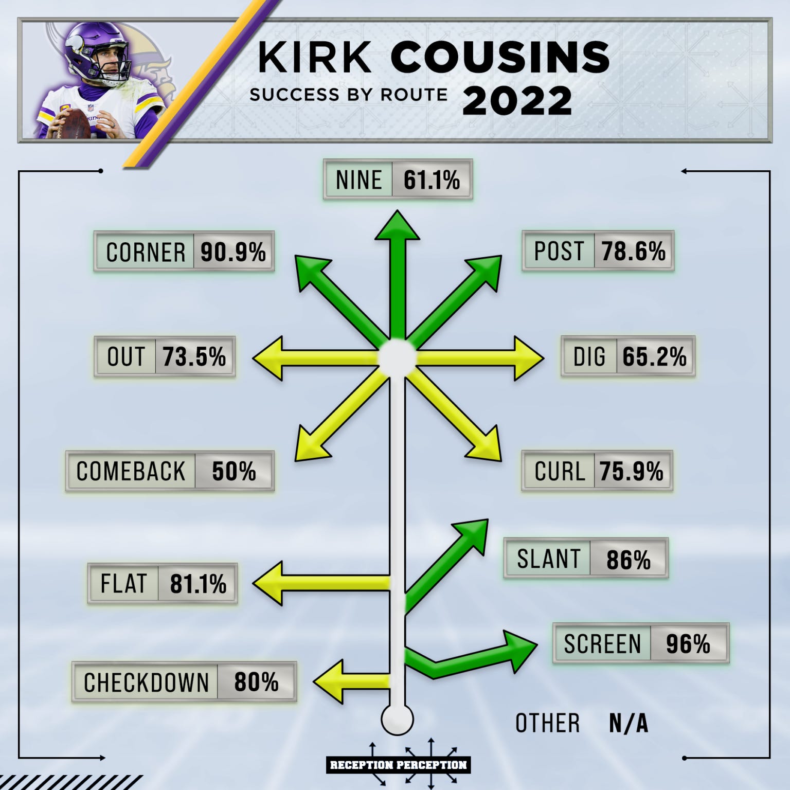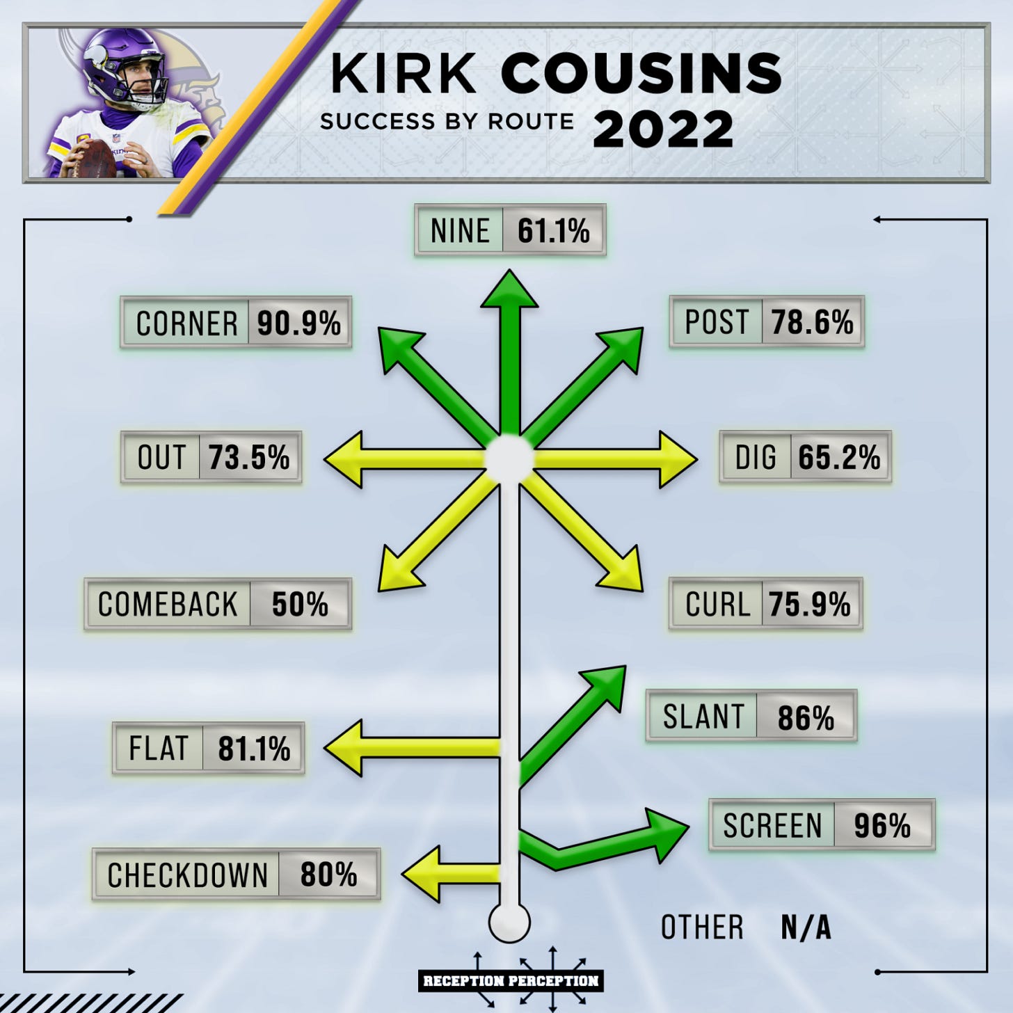 You know what’s worth the risk vs. reward? Corner routes. Cousins’s near 91% accuracy on corners is obscene. Patrick Mahomes only hit 70% accuracy on corners. Joe Burrow? 50%. Not even Aaron Rodgers (87%) matched him.