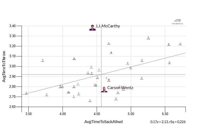 Here’s a chart that tells the story of the difference between the two quarterbacks. While both players’ sacks took about the same amount of time, throws from Wentz have come out as quickly as anyone in the league, while McCarthy’s time from snap-to-release is the slowest in the NFL among QBs with at least 40 attempts.