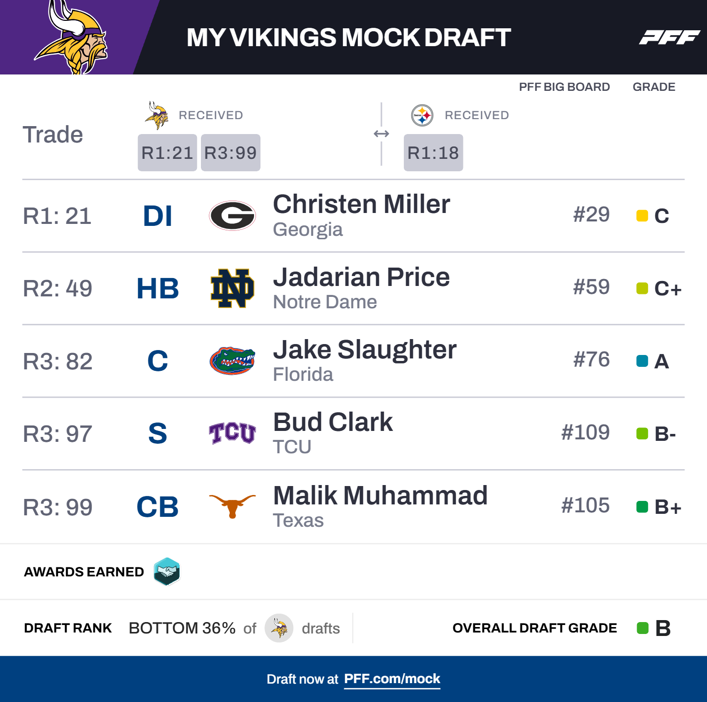 In this draft, the Vikings trade down three spots with the Pittsburgh Steelers in exchange for the 99th overall pick.
