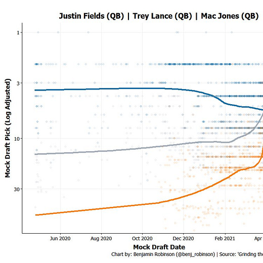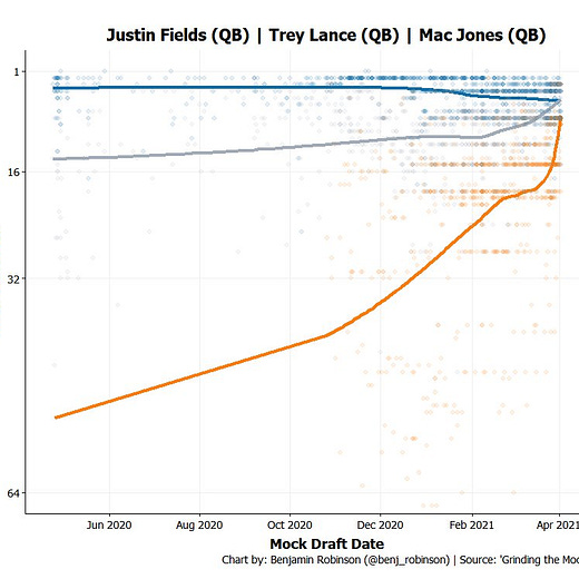 One thing that makes this scenario challenging is that we don’t know which quarterback is the most likely to drop. As the waters have become more and more muddy in the last few weeks with reports that the 49ers are likely to take Mac Jones rather than Justin Fields, it’s not easy to figure out whether the rumors are smokescreens or reality.