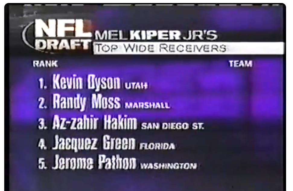 Lights are back on and the Tennessee Titans are on the clock. They pick Kevin Dyson. Yep, that’s right. Randy Moss was not the first WR taken. Kiper Jr. says he was a “better all-around player than Randy Moss was.” Alrighty.