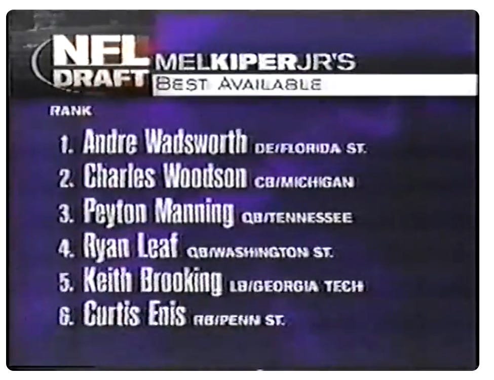 The 1998 draft broadcast on ESPN opened with Chris Berman calling it “D-Day for the deal makers” with highlights of Charles Woodson intercepting passes, running back punts and putting a rose in his teeth. Then it quickly transitions into Peyton Manning and Ryan Leaf.