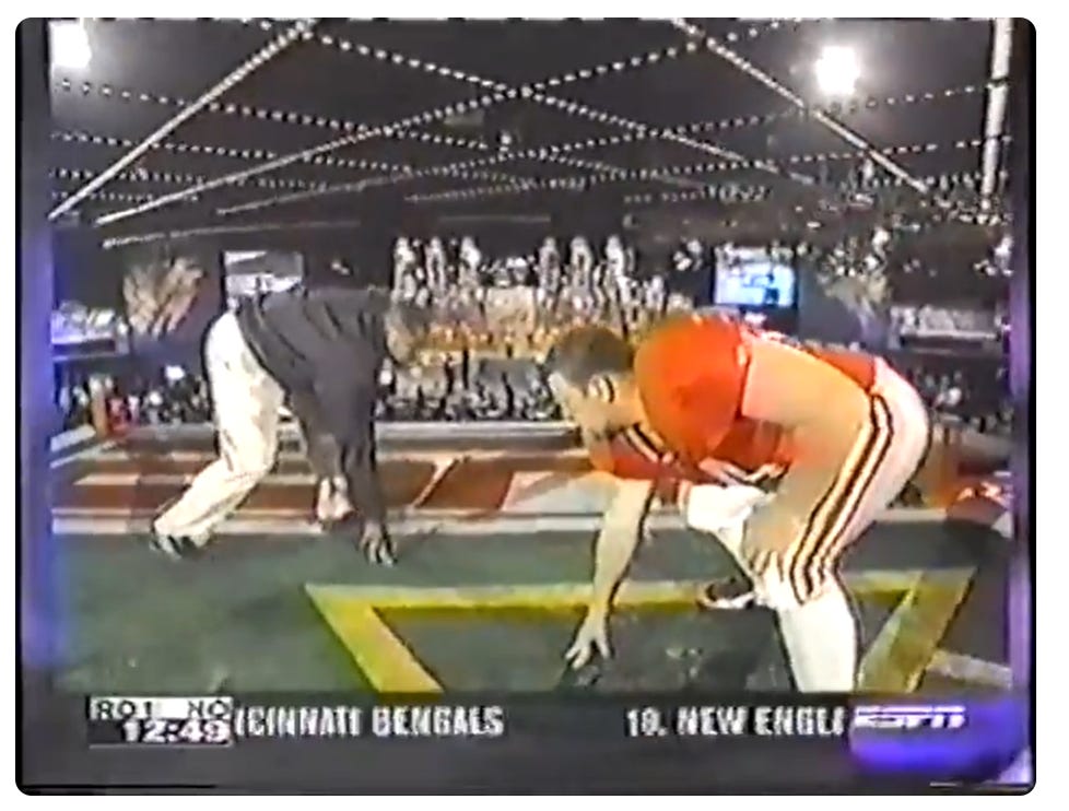 Tom Jackson shows us how Wistrom avoids cut blocks with a random large man dressed up as an offensive lineman. TV gold.