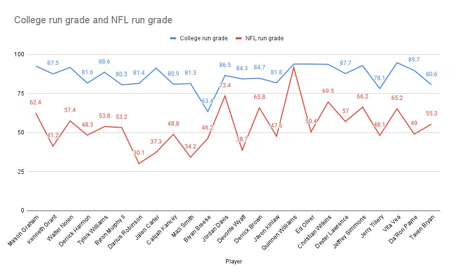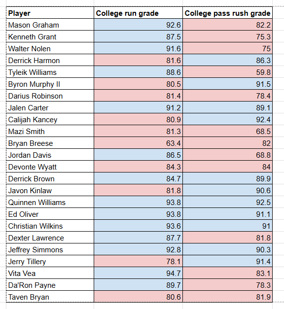 Players who were elite at both: Jalen Carter, Derrick Brown, Quinnen Williams, Ed Oliver, Christian Wilkins, Jeffery Simmons.