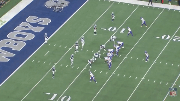 Yes, that’s the same concept from the Detroit game with Smith running under the formation. This time, however, he lines up as an outside receiver and comes in motion. Again, the entire offense gets a look at the defense and has an idea of how the Cowboys are going to play it. The defensive back on the weak side crashes toward the running back and Smith goes right by him.
