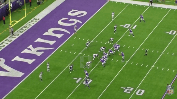 At the 2019 Combine, Smith Jr. ran a 4.63 40-yard dash, which ranked in the 83rd percentile of tight ends. Translation: He’s fast. So Kevin Stefanski/Gary Kubiak devised some misdirection plays to get Smith the football in space. The play below is an example of a play-action that looks like an outside zone run from the offensive line, two other tight ends and Cook. Smith Jr. comes underneath the formation into wide open space.