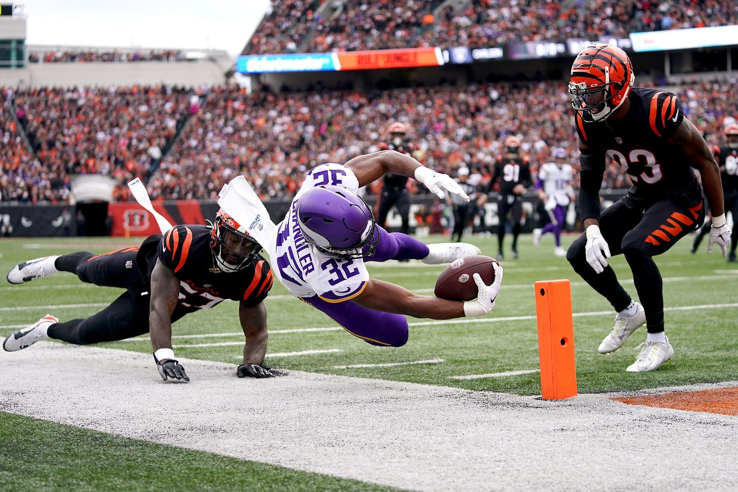 The Minnesota Vikings’ 27-24 loss to the Cincinnati Bengals may not exactly be one that Vikings fans want to re-live over and over for the rest of time but it did have some fascinating elements that might have implications that go beyond just one game. Namely, the emergency of Ty Chandler as a dynamic running back with exceptional patience and burst and an approach late in the game from Cincy’s offense that caused the secondary some problems. Head coach Kevin O’Connell said that Chandler will be “featured” going forward and the Vikings will need a solution on defense or we could see copy-catting from the Lions and Packers going forward.