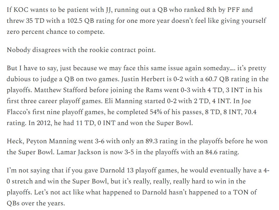 Adam B… The post-season JJ narrative has felt like a real pile on - he’s basically viewed as an irredeemable bust or at best a multi-year reclamation project. His character’s been assassinated based on a couple of minor incidents, his good games dismissed due to weak opposition (unlike Drake Maye) and ultimately the sample size is tiny! I also have my doubts but with other QBs having similarly woeful games under KOC’s scheme - Darnold (Jags/Ram), Dobbs (Bears), Cousins (Eagles), Mullins (Raiders), Hall/Brosmer (all) - surely there is a non-zero chance he makes a significant leap, beats out a vet in camp, and gets 10 wins as a starter? Or is that pure cope?