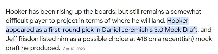 After the Combine, for some reason, Hooker’s stock went through the roof even though clearly nobody in the league thought he was anywhere close to a first-round pick. He was consistently considered a middle-second type player by the mocks and then he magically became a first-round prospect. What happened? My guess is that one popular draft analyst reported around the Combine and then everyone copycatted that. Oh hey look what I found with a quick little Google search!