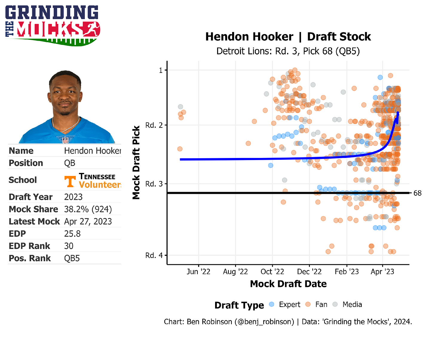 My first thought is about the mythology of rising draft stock. Two of my favorite websites around draft time are Mock Draft Database and Grinding The Mocks because they track the wild changes in outside opinion when it comes to prospects. Here’s a great example of a player’s “rising” stock: Hendon Hooker.