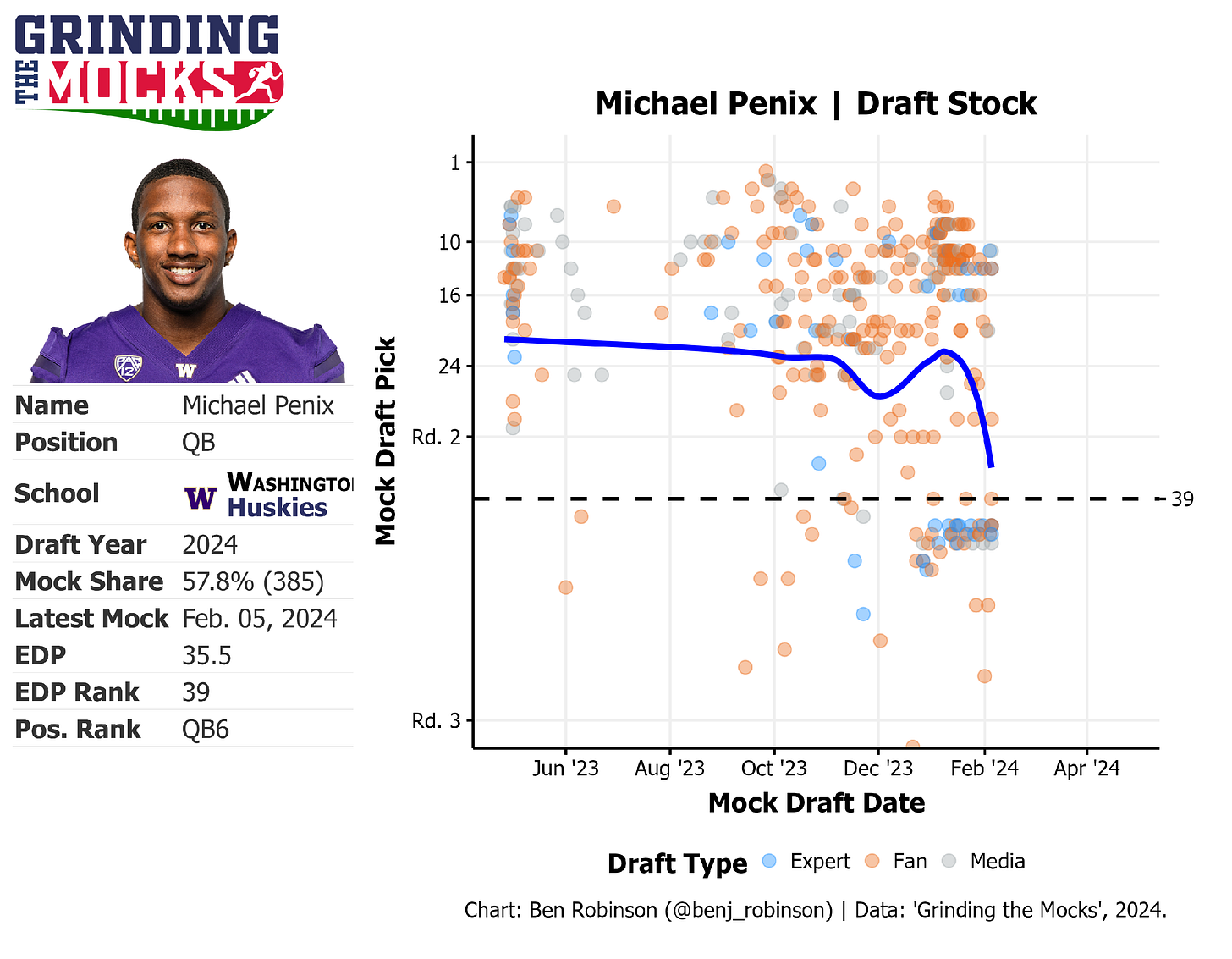 Yeah, you can definitely see the impact the national championship had on his draft stock, which is honestly pretty silly considering how much better Michigan was than every other program in the country. Their defense made everyone look horrible. But here’s something worth noting: Penix Jr. was never all that high in the mock draft universe. He was always considered a fringe first round prospect.