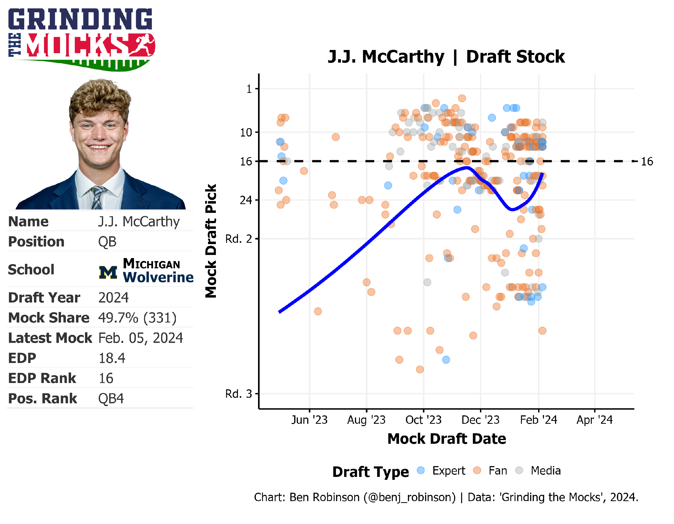 Personally I don’t see the first-roundness with McCarthy. I feel like I’m looking at Desmond Ridder 2.0 where everyone explains to me why I should love him as a first-rounder but I can’t really put my finger on what his superpower that would make him a franchise QB is supposed to be. (Ridder was 33rd in Mock Draft Database by the way).