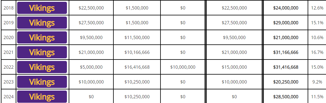 Chuck…. I don't think we've talked much at all about JJ's contract, so a quick question on that. Is there a reason I'm missing why the Vikings wouldn't put a huge amount of JJ's cap hit in the first year of a potential extension, like for 2024? Just thinking strategically-if you draft a QB, and you are resetting the roster a bit anyway, why not use that space right away to absorb some of that money. If you figure '25-'27/28 are the years you'd really go for it if you hit on the QB anyways, it seems to me the '24 cap space is best spent there, not to mention the cap only goes up.