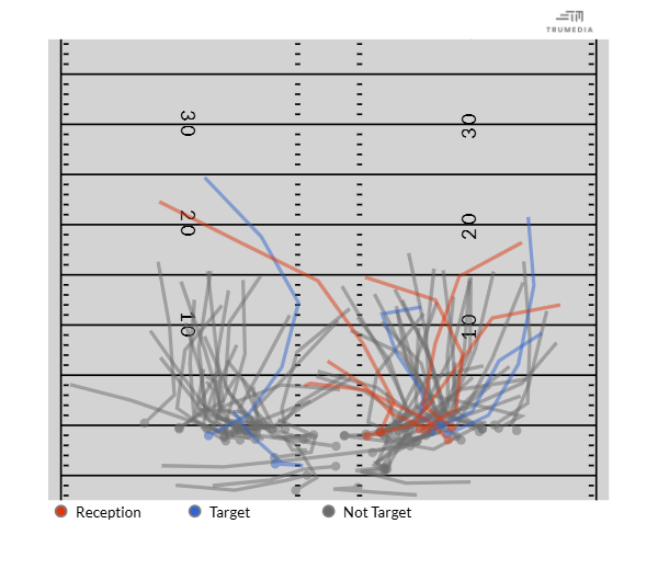 A lot of the grey routes are underneath. A lot of his attempts were downfield. Again, that says to me that he was trying to stick with the read and not getting rid of it. I saw another stat today that he threw like one checkdown in the two games.