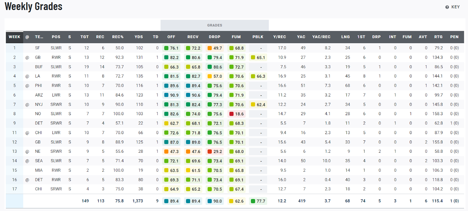 Adam Thielen’s 2018 season has the distinction of being the most-valuable season among non-quarterbacks during the PFF era (2006-present), and he’ll likely need to compete at such a level to stave off the effects of losing Stefon Diggs. The tricky part about expecting this out of Thielen is that his production has always been higher in the west coast-like systems deployed by the Pat Shurmers and the John DeFillipo’s of the world, where he could roam from the slot against weaker defenders. If the Vikings continue to use three-receiver sets at the league’s lowest rate, such expectations might not be realized in 2020, especially given the presence of the slot-heavy rookie, Justin Jefferson.
