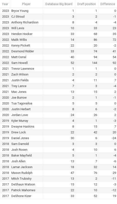 Here is a comparison of Mock Draft Database’s final big board positions of all QBs who were pre-draft expected to be first or second-round picks versus where the quarterback was actually picked…
