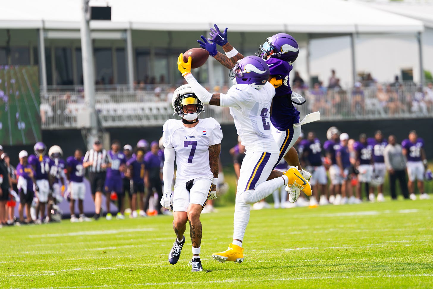 EAGAN — The Vikings were back at practice on Thursday at TCO Performance Center. Left tackle Christian Darrisaw did not participate in practice as he continues to get to 100% following an ACL injury last year. Here’s what else stood out from Thursday’s press conferences and locker room…