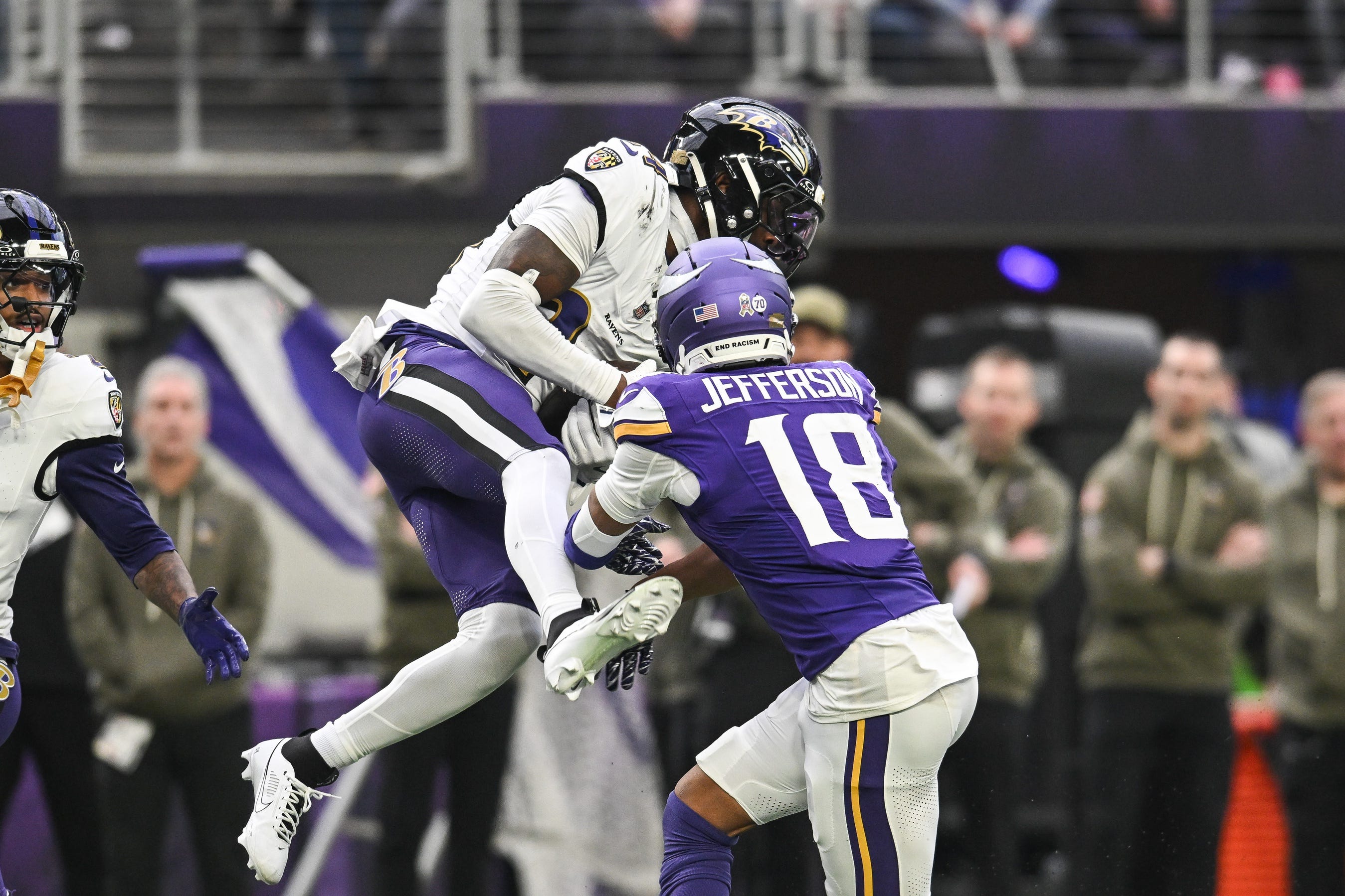 Midway through the second quarter, McCarthy tried to hit Justin Jefferson at the Baltimore 20-yard line. However, the star receiver tripped and free safety Malaki Starks easily picked off the uncontested ball to set up a Ravens field goal.