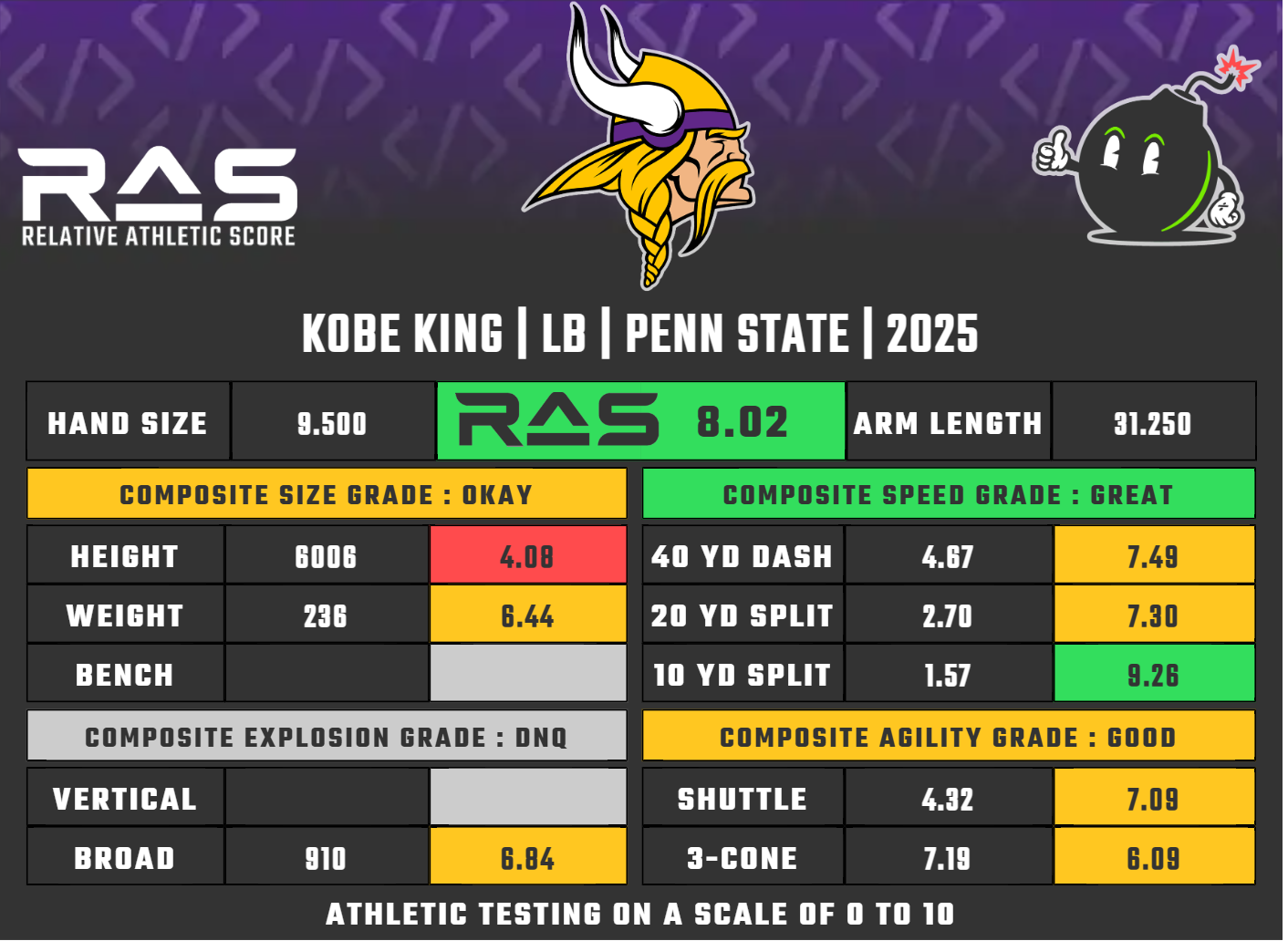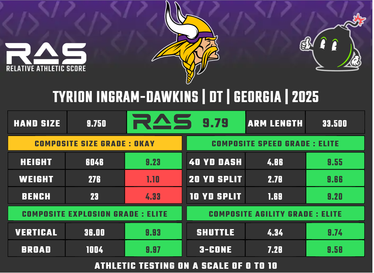 His numbers showed some promise but do not jump off the page. He only played more than 225 snaps for the first time in his career in 2024 and ended with just 19 pressures and a decent 70.8 PFF grade against the run. But the Vikings aren’t so much focused on the numbers with Ingram-Dawkins because his athletic profile and character makeup were very high. He crushed the NFL Combine, scoring in the 98th percentile by Relative Athletic Score. His performance in Indy included remarkable explosiveness numbers in a 36-inch vertical and 96th percentile 40 time.