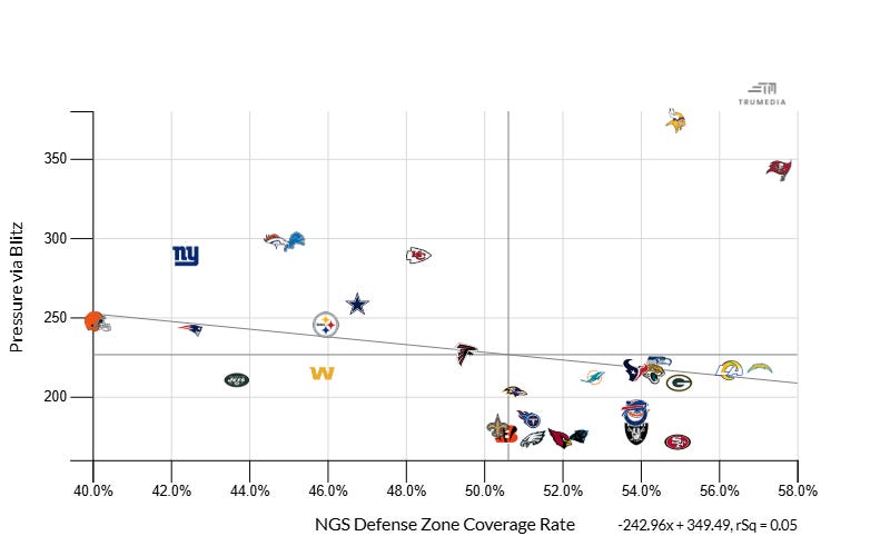 The Vikings under Flores aren’t just good, they are fascinating. He has been at teh forefront of innovation when it comes to post-snap deception and blitzing. The chart below shows that the Vikings have created the most pressures via the blitz in the NFL since 2023 and play the sixth highest percentage of zone defense.