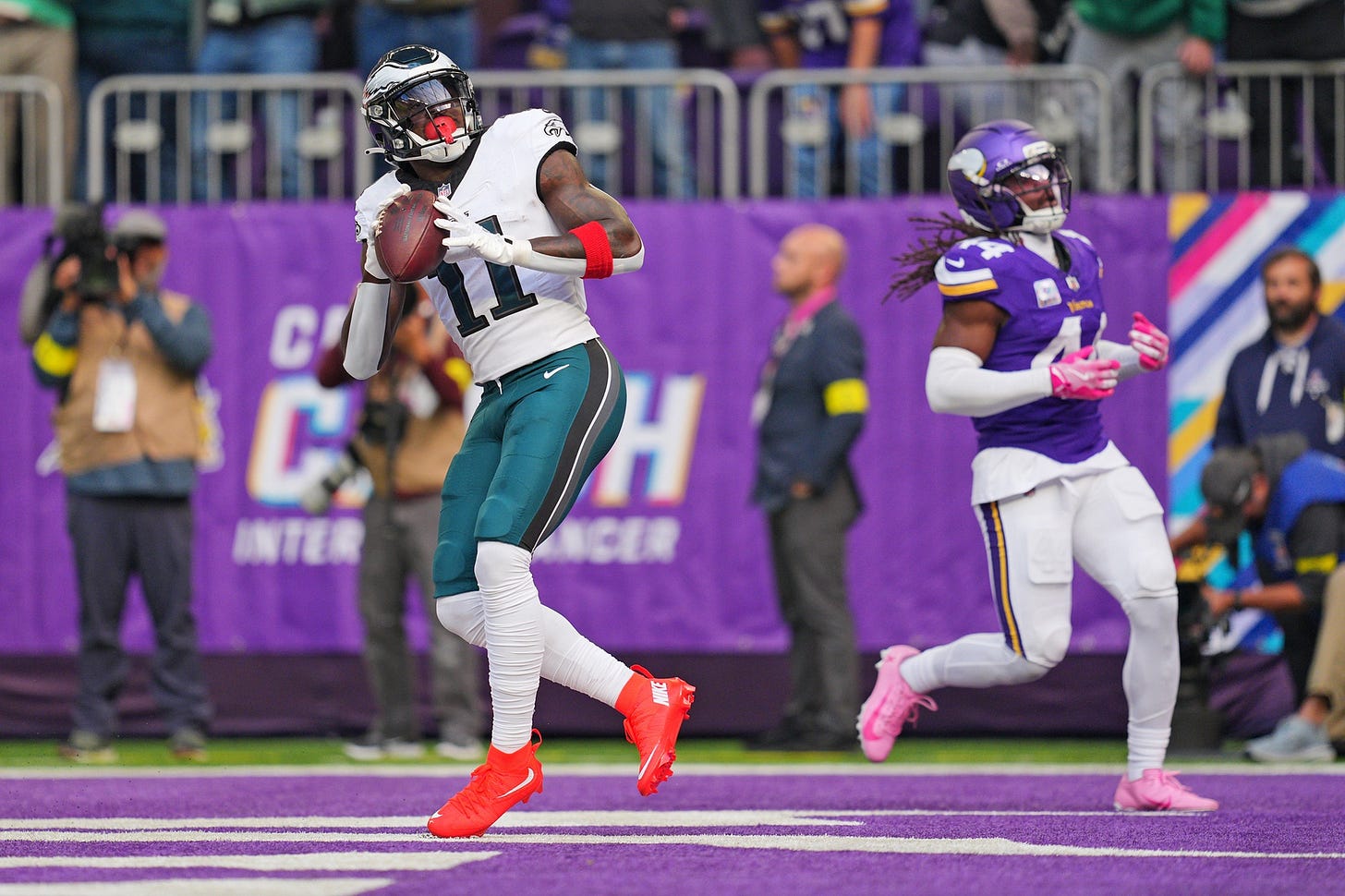 In the third quarter, for example, the Vikings settled for their third of five field goals to bring the score to 14-9. On second-and-5, Hurts launched the ball deep and it fell perfectly into the hands of DeVonta Smith, who trotted into the end zone for a 79-yard touchdown.
