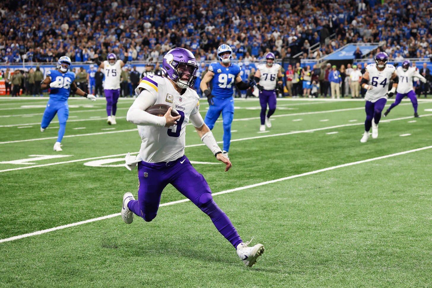 McCarthy threw a rollout touchdown to TJ Hockenson on the following play. Putting 14 on Detroit right away set the tone for the way the entire game was played.
