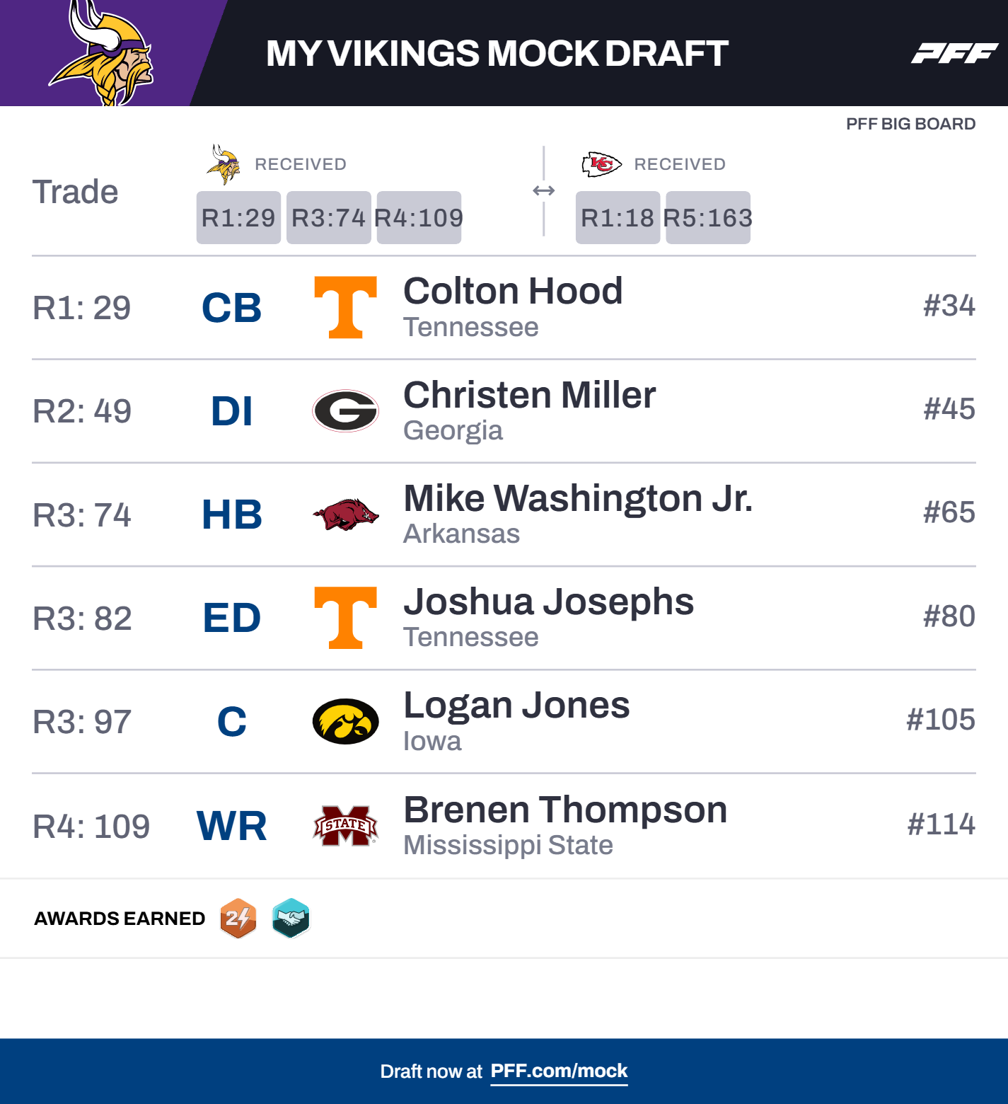 The stay-calm iteration has the Vikings trading down with the Kansas City Chiefs to the 29th overall pick. They get No. 74 overall and make a fourth-fifth pick swap that moves the Vikings up 64 spots. The trade allows them to add another potential impact player within the top 100 picks without a major sacrifice.