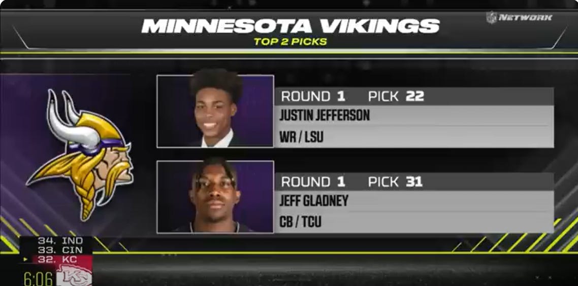 If someone ever tells you that the draft isn’t random, show them the graphic with the Vikings picking Justin Jefferson and Jeff Gladney back to back.