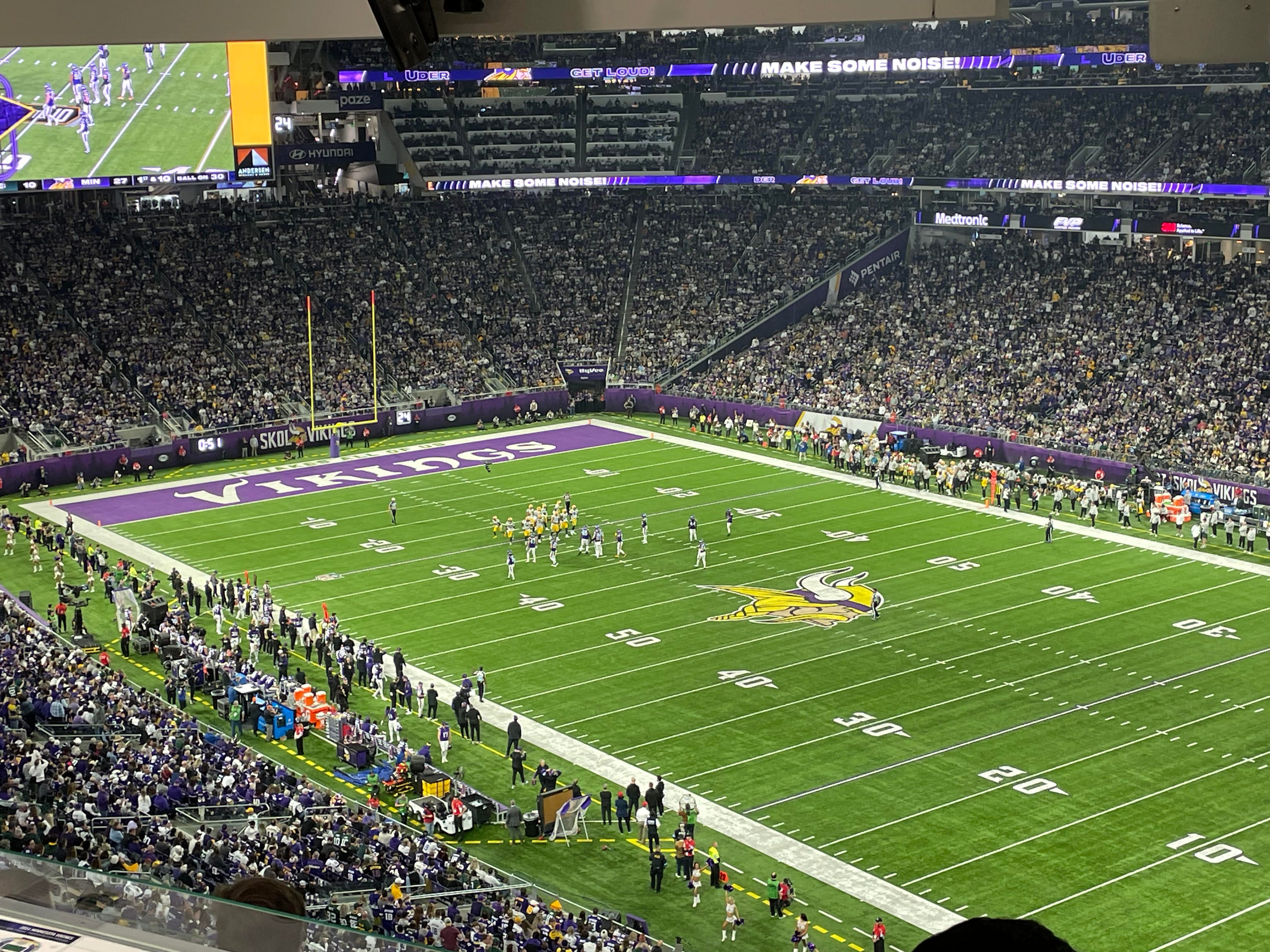 Smith and the defense took the field to open the game as the Packers won the toss and elected to receive. Right away the crowd’s ability to impact the game would be tested with a third down following a handoff to Josh Jacobs and short completion by Jordan Love. If you remember last year, Love wasn’t intimidated at all by the pomp and circumstance of US Bank Stadium. That was the case on this early third down, too, as he converted another quick throw easily.
