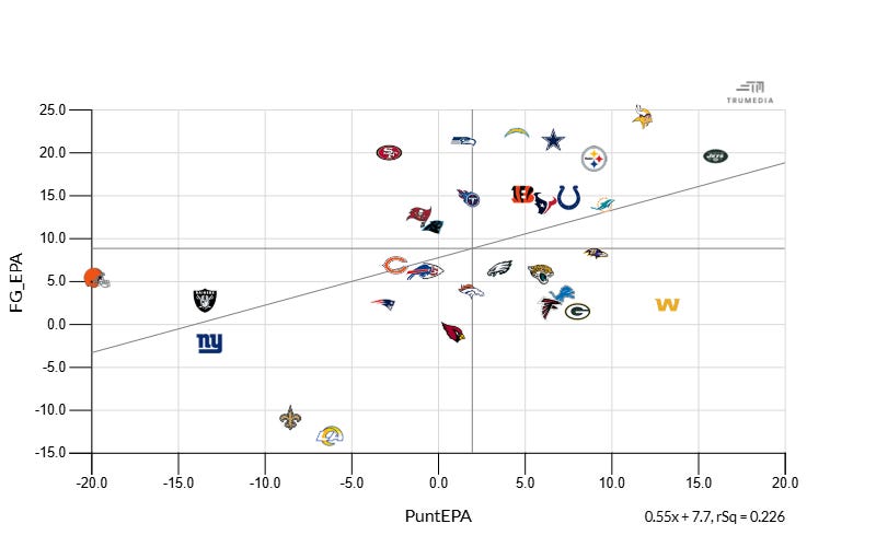 The average EPA this season is +2.0 points on punts and +8.8 on field goals. The Vikings’ punt unit is blowing that out of the water with +11.8 (second) and the Vikings’ kicking is No. 1 with 24.3 points added (per TruMedia).