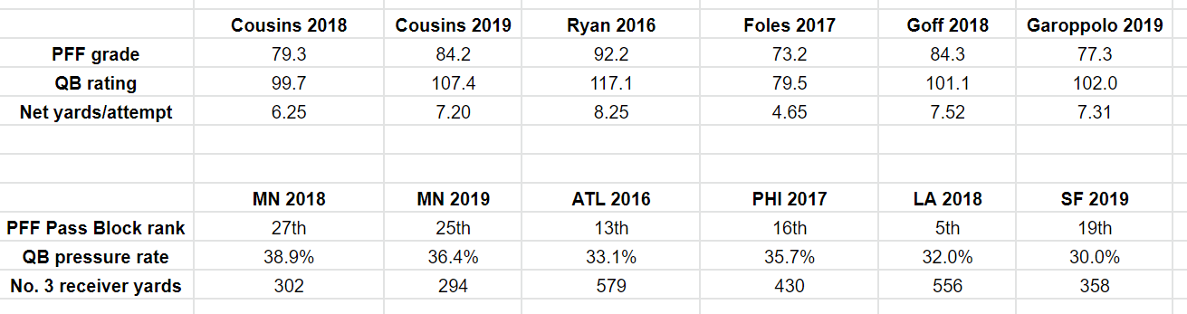 You can see that Cousins wasn’t quite on the level of Ryan’s MVP 2016 season but he was as good by most measures in 2019 as Foles, Goff and Garoppolo in the years they reached the Super Bowl. But the Vikings’ pass blocking, pressure rate and yards by their No. 3 receiver were nowhere close in most cases to the teams that went to the Super Bowl.