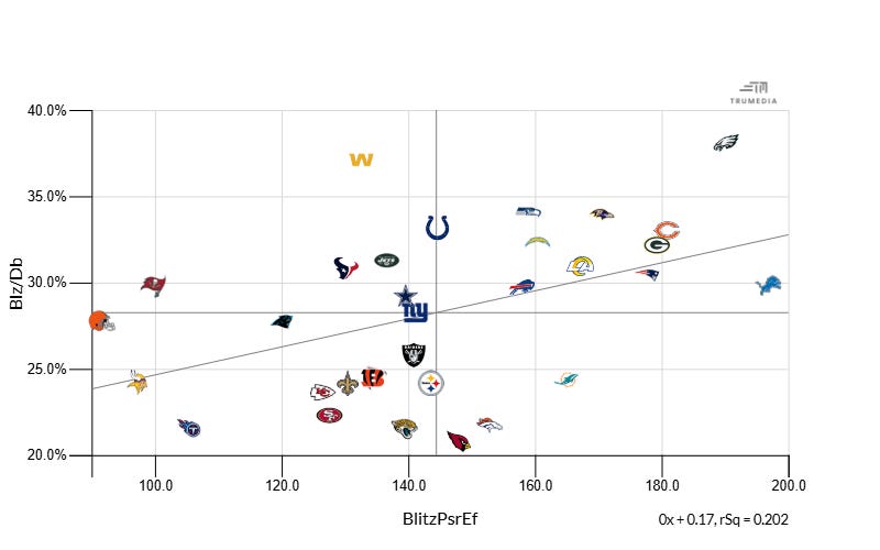 Overall, opponents have not blitzed the Vikings very often — most likely because the Vikings have been trailing — but they have had the league’s second worst efficiency rating per TruMedia when facing the blitz. Carson Wentz only completed 48% of his passes and had a 66.7 QB rating versus extra rushers.