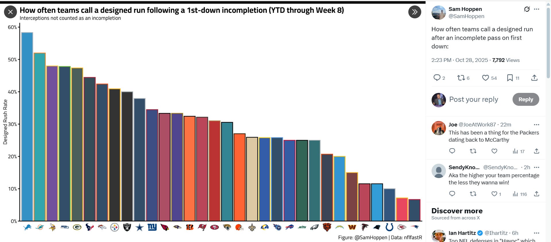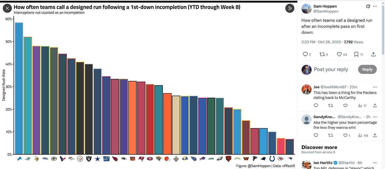 Where there could be a play calling change is on second down. Per analytics analyst Sam Hoppen, the Vikings have called the third most runs following a first-down incompletion. A fair number of successful teams have done the same but it’s generally not ideal to run on second-and-10.