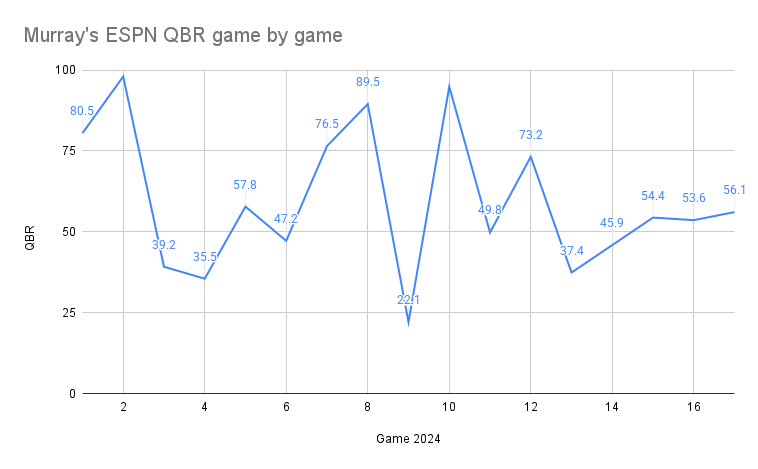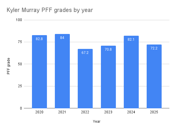 In his three full seasons during that span, Murray ranked 12th (2020), 7th (2021) and 12th (2024) by Pro Football Focus’s grading system in terms of overall grade.