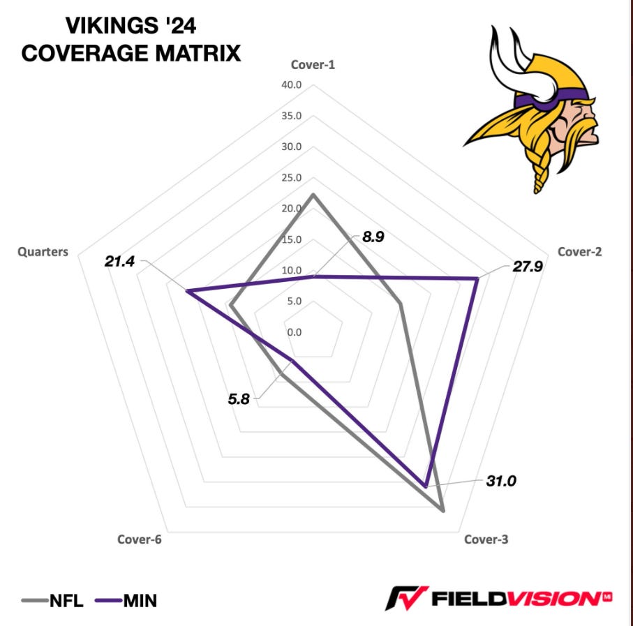 In a copycat league, that’s something quarterback JJ McCarthy now has to plan for as well. Five years ago, there were 35 full-time corners who played at least 35% of their snaps in man coverage (per PFF). Last year only 16 CBs played more than 35% and only six were over 40% and they all came from either Detroit or New England.