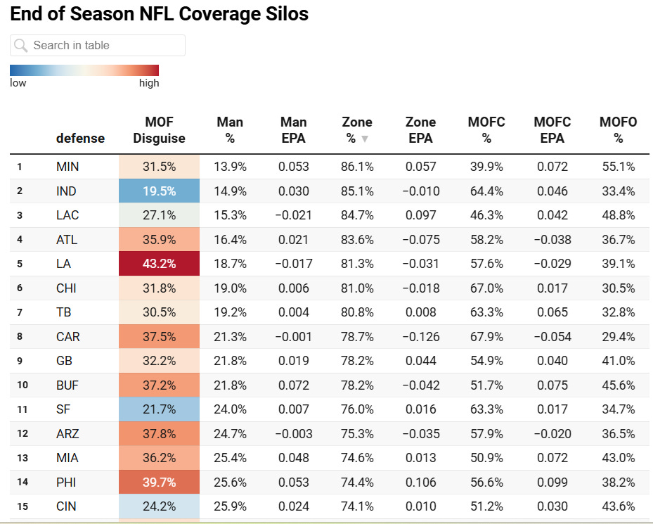 While the linebackers are the same, one area where the Vikings personnel is different this year is at cornerback. Some of the extreme lean toward cover-2 and cover-4 may have been to protected the well-traveled Stephon Gilmore (9th in zone coverage rate) and veteran Shaq Griffin from being attacked one-on-one by offenses.
